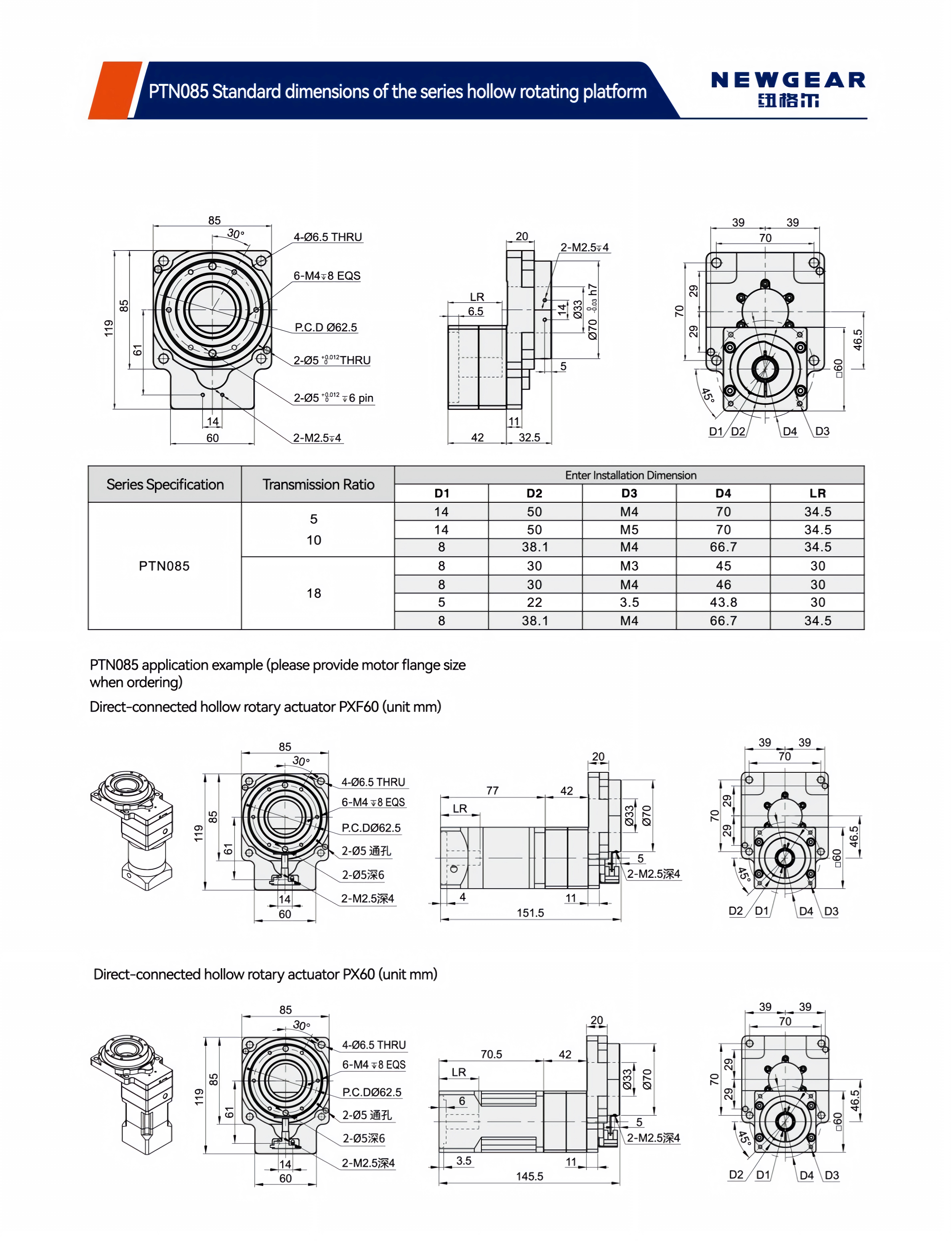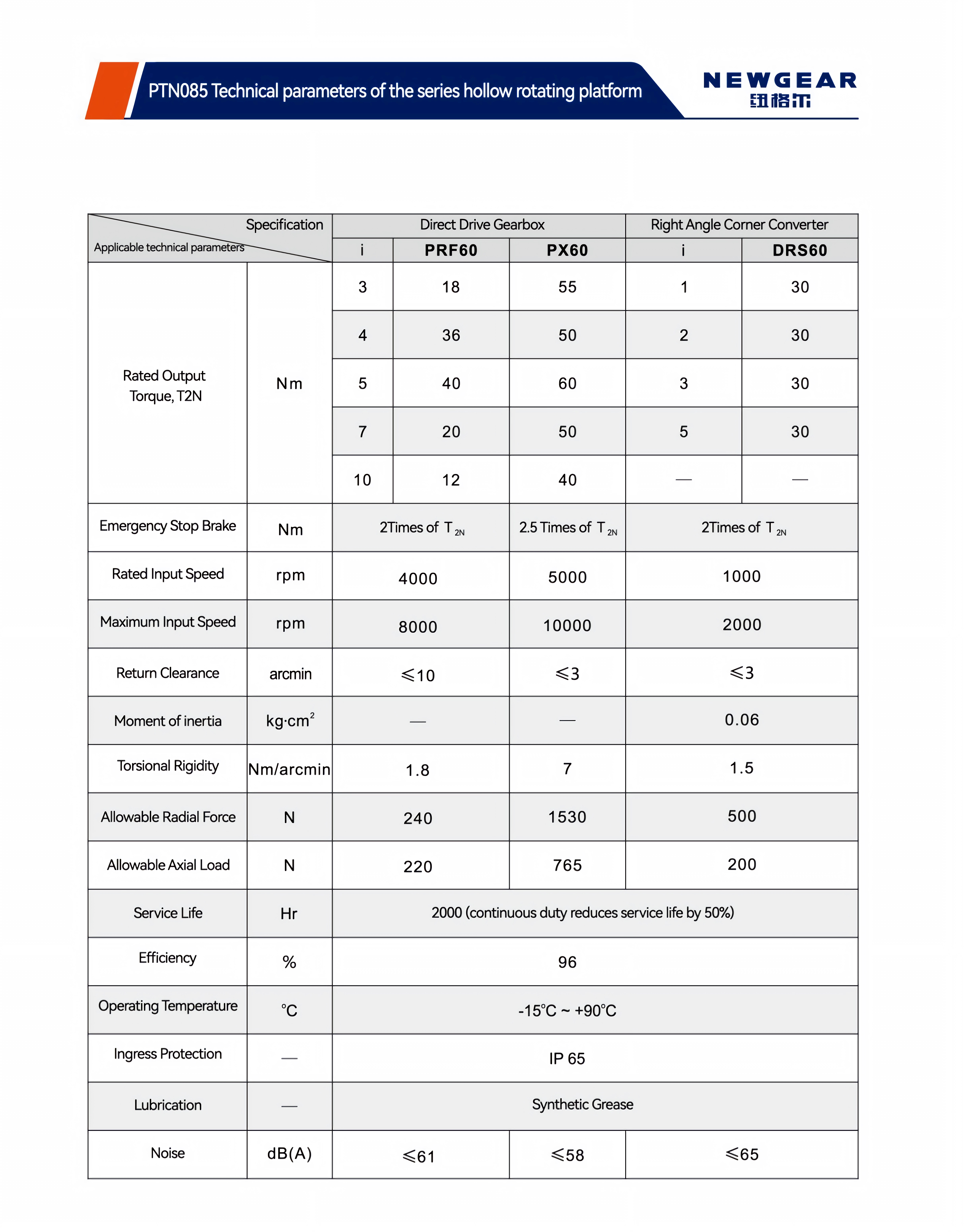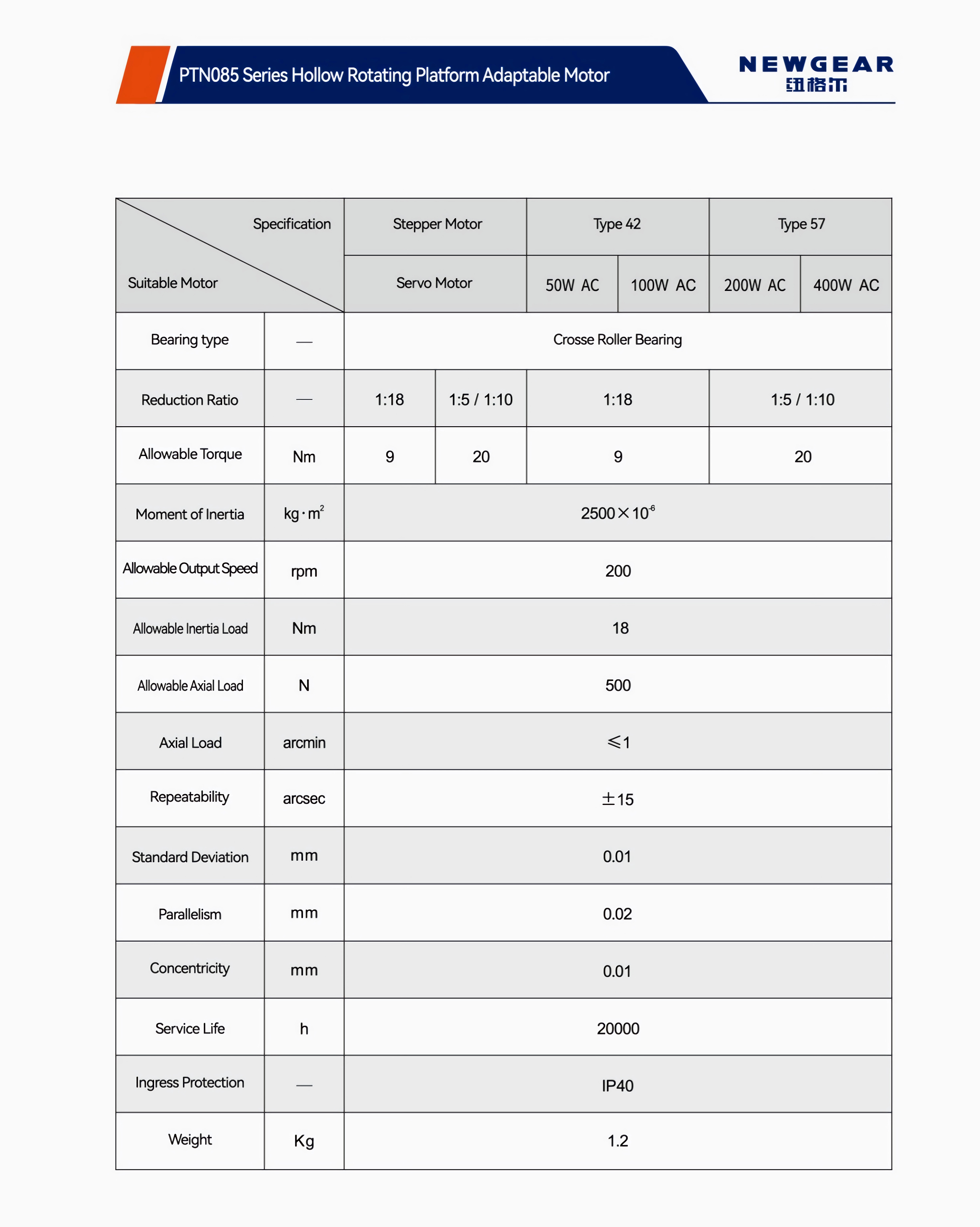 La table rotative creuse PTN085 est polyvalente et compatible avec les moteurs pas à pas NEMA 17 et 23 ainsi qu'avec les servomoteurs AC de 50 W à 400 W. Elle offre des rapports de réduction de 5, 10 et 18:1, un jeu angulaire ≤ 1 minute d'arc et une répétabilité de ± 15 secondes d'arc. Sa structure rigide à roulements à rouleaux croisés et sa conception à trous traversants lui confèrent une capacité de charge élevée et facilitent le passage des câbles. Certifiée IP40, elle est adaptée aux environnements industriels courants. De plus, elle peut être associée à nos réducteurs planétaires PX60/PRF60 pour étendre les options de couple et de rapport de vitesse, offrant ainsi une solution rotative robuste et adaptable à diverses applications d'automatisation.